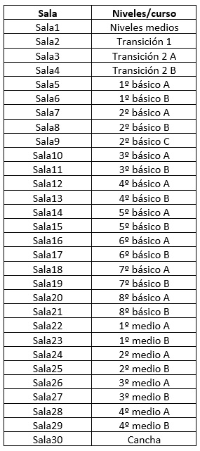 Cada curso tiene asignada una sala de clases. Esta asignación es la siguiente: